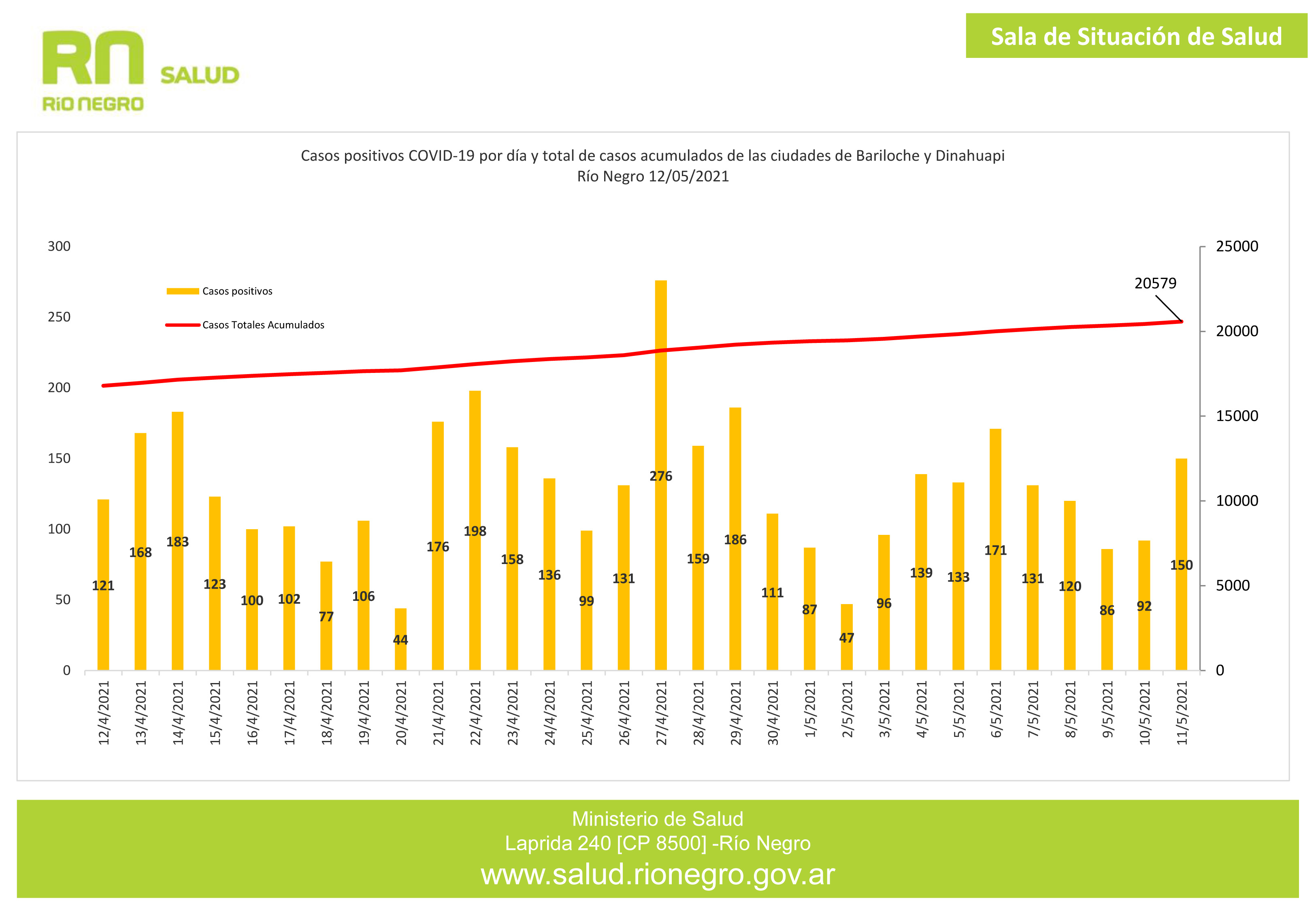 El cuadro de situación epidemiológica (ver adjunto) muestra que Los casos positivos de COVID-19 acumulados hasta el miércoles 12 de mayo son 20579 (19917 en Bariloche y 662 en Dina Huapi). Actualmente los casos activos (que se encuentran cursando la enfermedad) son 1682: 1647 para la ciudad de San Carlos de Bariloche y 35 para la ciudad de Dina Huapi. La tasa de letalidad (fallecidos totales dividido total de casos acumulados multiplicado por 100) es de 1,5% y 5,64%, respectivamente, con un total de 287 fallecidos.